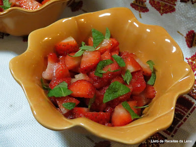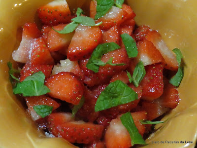 A receita base podem encontrar aqui. Acrescentei apenas umas folhas de hortelã-menta ligeiramente picadas aos morangos.