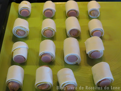 4. Corte as salsichas a meio, e com enrole cada metade numa porção de massa folhada cortada;